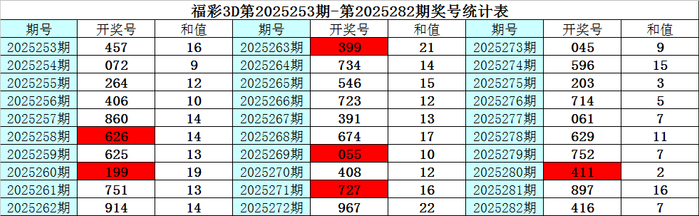 上期回顾:福彩3D第2025282期奖号为:416,其中奖号组选类型为:组六,奇偶比为1:2,大小比为1:2,012路比为1:2:0,和值为11,跨度为5。