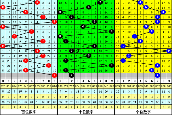 和值分析:最近10期和值分布5-24区段,和值振幅为20个点位,上期和值开出11,下降了13点,本期看好和值上升,关注和值18。 跨度:最近5期跨度开出范围在2-7区段,跨度振幅为6个点位,上期跨度开出5,上升了3点,本期预计跨度上升,注意跨度7。 百位分析:最近7期百位分别开出奖号:7、0、6、7、4、8、4,百位振幅为8个点位,本期看好该位号码上升,注意号码9。 十位分析:最近7期十位分别开出奖号:1、6、2、5、1、9、1,十位振幅为8个点位,本期预计十位上升,推荐号码2。 个位分析:最近7期个位分别开出奖号:4、1、9、2、1、7、6,个位振幅为8个点位,本期注意个位号码走大,关注一码7。