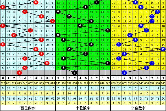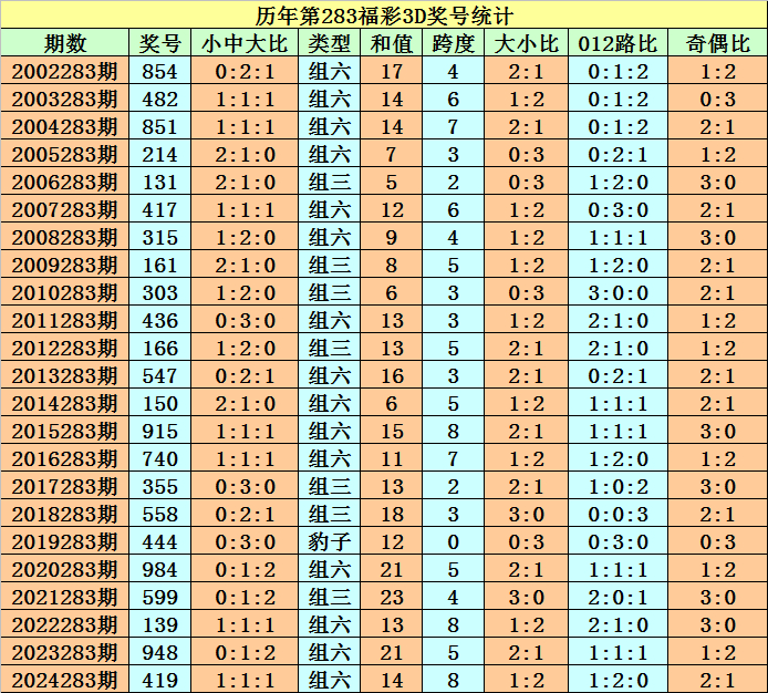 在历史同期号码中,组选0-9号码出现次数为:2出现2次,号码0、7出现3次,号码6出现4次,号码8出现6次,号码3、9出现7次,号码5出现11次,号码1、4出现13次,本期看好两码2、3出现。 在历年同期开奖中,豹子开出1次,组三出现7次,组六开出15次,组三轮空3年,今年同期防组三。