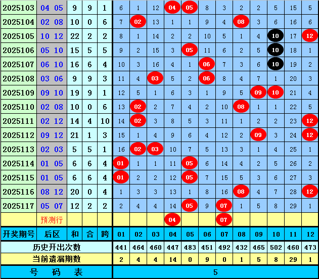 后区分析:上期后区开出奖号05和07,在最近50期开奖中,后区奖号012路落号比为31:35:34,前10期后区012路落号比为8:4:8,本期后区关注号码01、04、07、09、10,两码参考04、07。