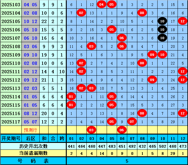 后区分析【一区01-04,二区05-08,三区09-12】:上期后区奖号为05和07,全部出现在第二区,近50期后区三区比为37:29:34,近10期三区比为7:7:6,本期注意第一、二区号码出现,关注两码03+06。