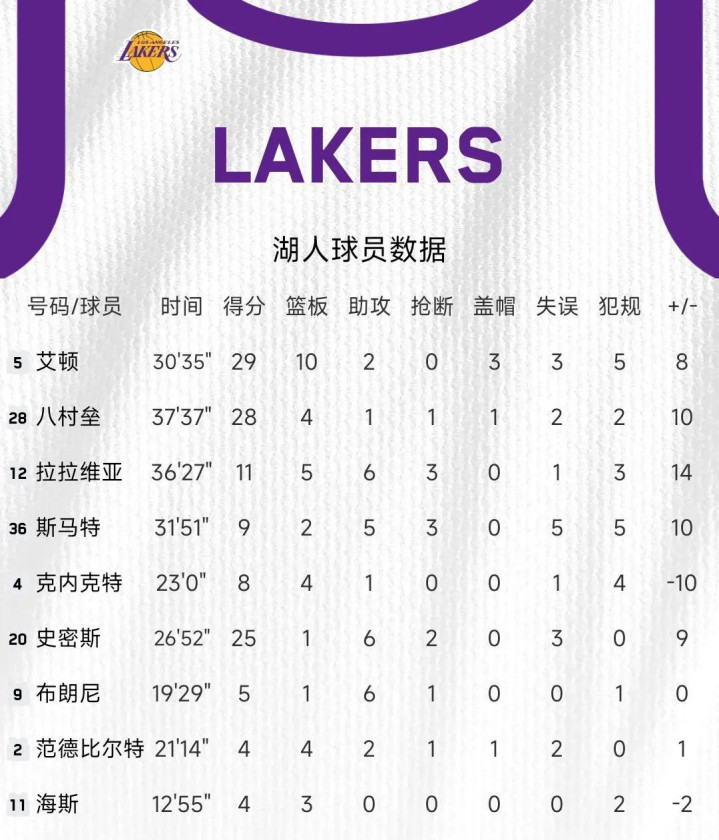 当然艾顿今天也是擎天一柱,中距离手感太好了。全场19中14得到湖人生涯新高29分10板的两双。八村也得到28分。这三巨头的存在弥补了真三巨头的缺席。