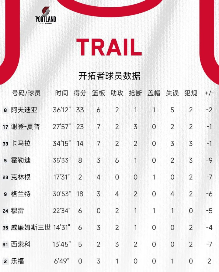 开拓者这边阿夫迪亚得到全场最高的33分,无奈双拳难敌四手,对面3个25+球员。杨瀚森本场比赛虽然被召回了,但是也没有得到出场机会!
