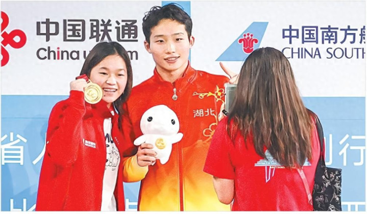 赛后,奥运冠军全红婵“蹭”来王宗源的金牌与其合影。(湖北日报全媒记者 时龚 摄) 湖北日报全媒记者 马明玉 106.40分,冠军!11月10日下午,在广东奥体中心游泳跳水馆进行的第十五届全运会跳水男子3米板决赛中,奥运冠军、湖北名将王宗源和队友郑九源包揽冠亚军。继男子1米板夺冠后,王宗源斩获个人赛会第二金。这是十五运会开幕后湖北体育代表团的首金,也是代表团竞技体育项目第四金。 “这场决赛应该最没悬念吧,冠军肯定是王宗源。”决赛前,蜂拥而来的全国记者对冠军归属高度认同,他在预赛和半决赛中的断崖式领先已经无人撼动,既然打不过,那就欣赏呗。 8日的预赛和半决赛,王宗源均比出了领先第二名80分+的绝对优势。决赛中,他完美复刻一整套高质量动作,第一跳88.40分排名第一,第二跳和第三跳分别拿到92.75分、95.55分,前三跳均为最高分。随后两跳,王宗源持续保持着稳定的发挥。在这个时间段,队友郑九源第三跳从排名第二位降至第三,第五跳他顶住压力拿到96.90分,重回第二。最后一跳,郑九源拿到97.50分再创新高,王宗源则以完美的发挥拿到106.40分的全场唯一破百高分。
