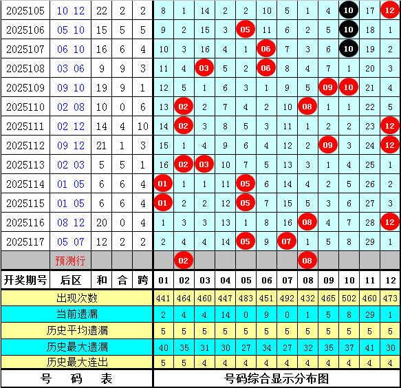 后区一号球尾数:该位上期开出尾数5下降3点,最近5期该位尾数升平降走势为:降→降→平→升→降,前10期尾数升平降比例为3:5:2,前30期尾数升降平比例为14:13:3,本期预计该位尾数下降,参考尾数2。 后区二号球尾数:该位上期开出尾数7上升5点,最近5期该位尾数升平降走势为:升→升→平→降→升,前10期尾数升平降比例为5:3:2,前30期尾数升降平比例为14:12:4,本期注意该位尾数上升,看好尾数8。