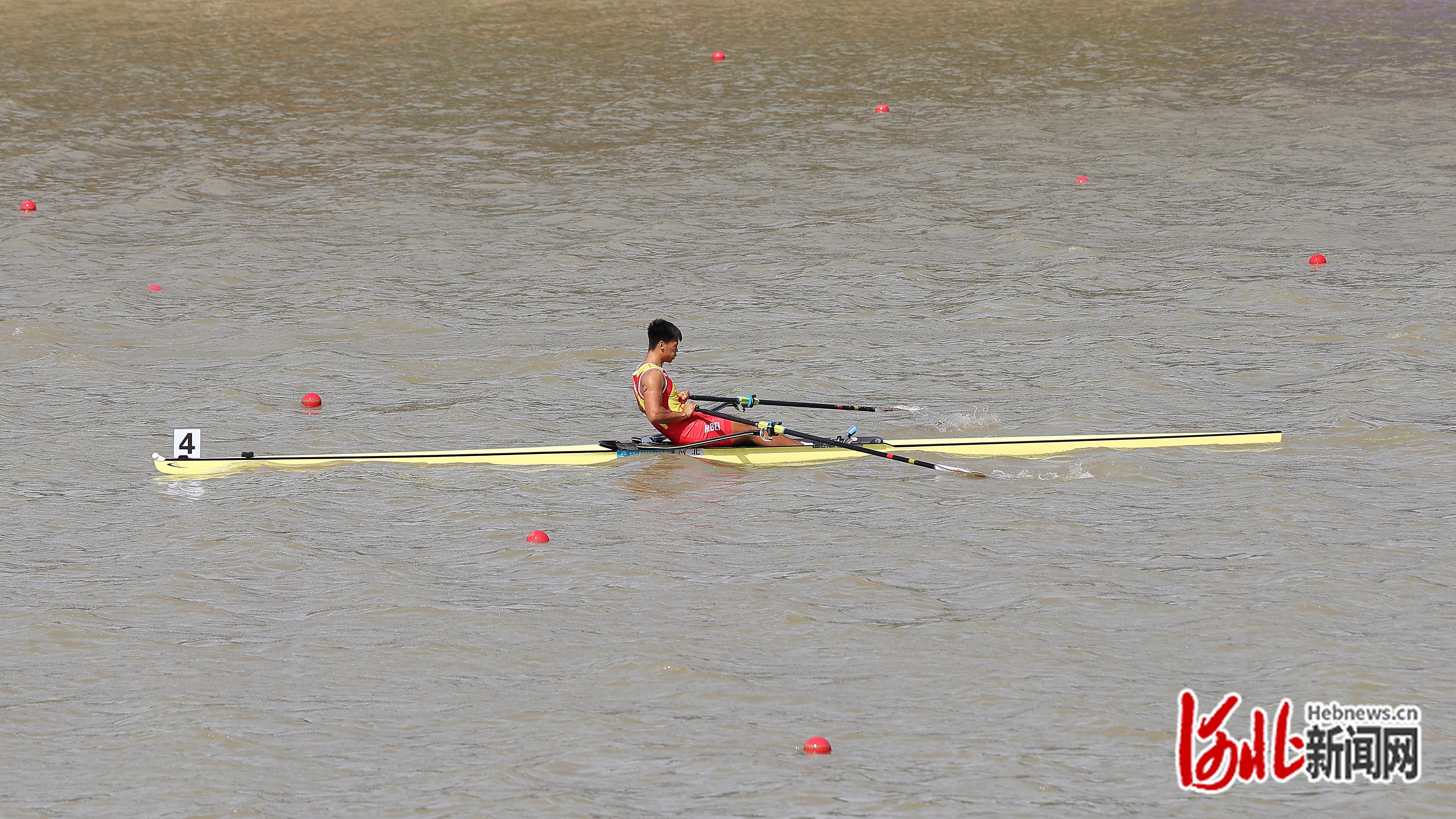 11月10日,在第十五届全运会赛艇男子单人双桨决赛上,河北选手韩崴获得银牌。这是本届全运会开幕式后河北省代表团获得的首枚奖牌。图为韩崴在比赛中。河北日报记者 耿辉摄 |